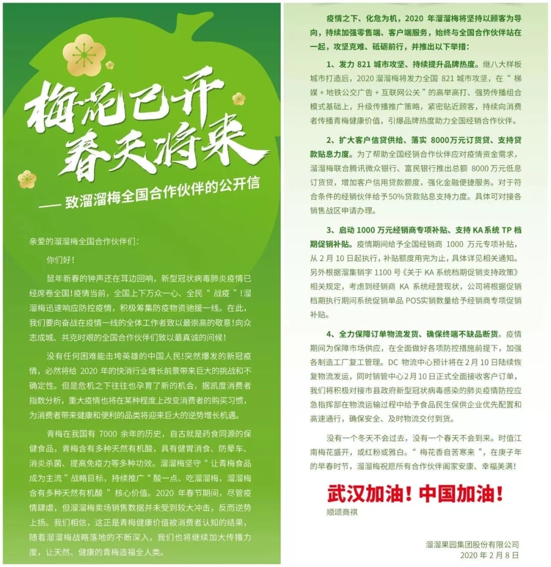 2月8日,溜溜梅通过其官方微信发布《致溜溜梅全国合作伙伴的公开信》,其中溜溜梅提出对经销商合作伙伴的4项扶持举措,包括:启动1000万元专项补贴,支持KA系统档期促销;厂家担保8000万元低息订货贷,并贴息50%;全力保障物流安全及时交付;持续发声,提高品牌热度,助力合作伙伴等。