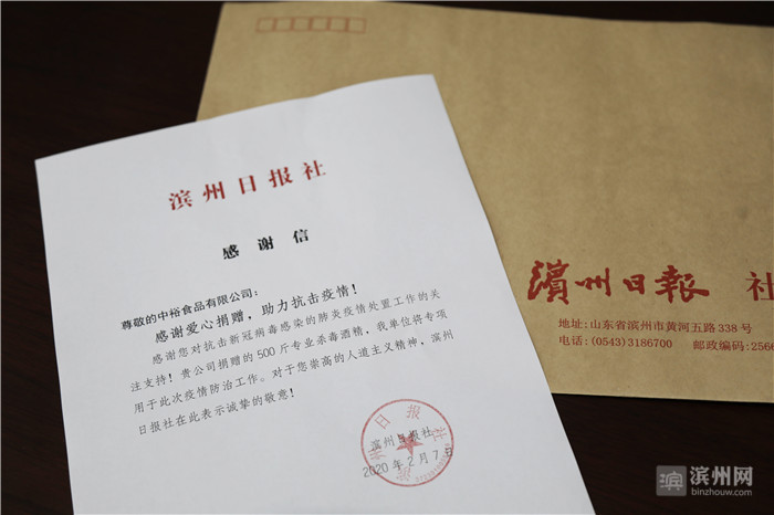 滨州日报社接受捐赠,并对滨州中裕食品有限公司表示衷心的感谢,对他们在特殊时期的大爱义举表示诚挚的敬意。