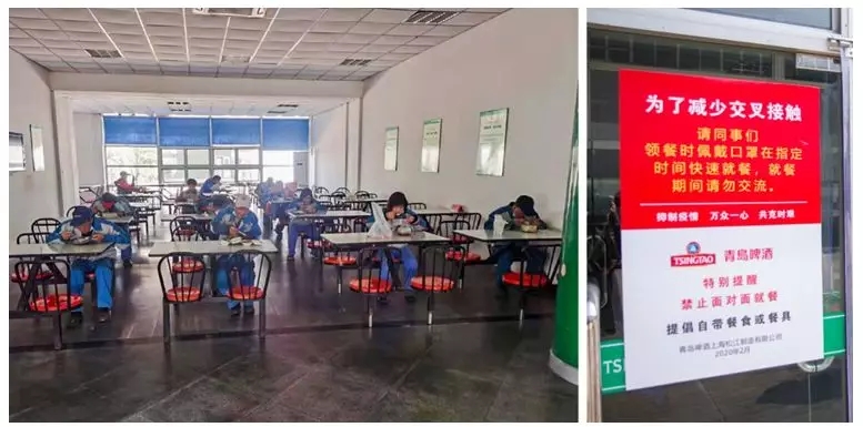 松江、廊坊等公司针对就餐做好安排,鼓励员工自带餐具用餐,并提供一次性餐具;食堂门把、桌椅、刷卡机,每餐开餐前用酒精擦拭消毒;食堂人员做好灶具、锅等器具消毒工作,确保饭菜煮熟;员工分批次就餐,就餐时面朝一个方向,一人一桌,要求员工做到速食速离,遇餐厅内员工就餐无空位,要求员工带好口罩在餐厅外排队,排队间隔距离1.5米以上。疫情当前,各单位互帮互助,备足物资。日照公司积极争取当地政府支持,千方百计协调口罩货源,采购了一批KN95口罩,暂时满足了工厂及营销将士返岗复工的紧急需求,并第一时间将1000只口罩及消毒剂等防疫物资送到备战节后市场的大区营销将士手中,并表示将根据疫情发展和大区需求,继续为大区提供防疫物资等支持。