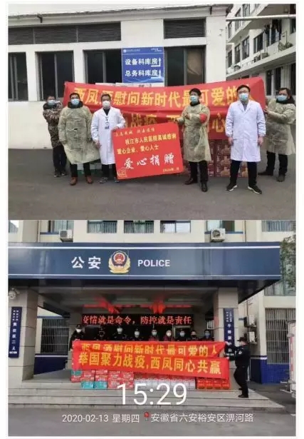 2020年2月12日起,西凤酒首批慰问物资已安全送达各抗疫一线,公司联合全国300多个城市经销商,齐心协力为抗疫定点医院、公安局、交警队、环卫等一线服务部门送去慰问物资。本次慰问活动以“举国聚力战疫、西凤同心共赢,慰问新时代最可爱的人”为主题,投入上千万的资金,并且由分公司组织,与经销商共同带领团队慰问,分公司在当地的业务人员全面配合。