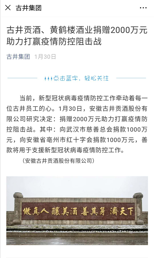 这是1月30日古井集团官方微信发布的一条简讯:安徽古井贡酒股份有限公司研究决定,捐赠2000万元助力打赢疫情防控阻击战。其中,向武汉市慈善总会捐款1000万元,向安徽省亳州市红十字会捐款1000万元,善款将用于支援新型冠状病毒疫情防控工作。
