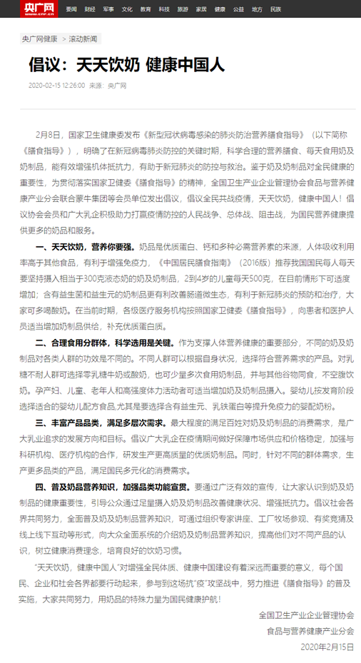 2月15日,蒙牛与全国卫生产业企业管理协会食品与营养健康产业分会向全社会联合发出《天天饮奶 健康中国人》倡议。这是乳品行业对国家卫健委发布的《新型冠状病毒感染的肺炎防治营养膳食指导》(以下简称《膳食指导》)的深入贯彻和切实落地。