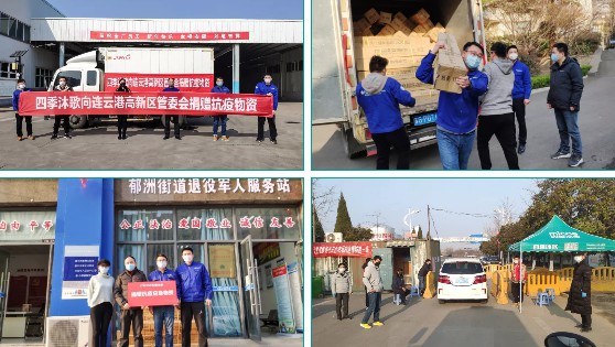 2月12日,四季沐歌连云港基地向连云港市高新区管委会定点捐助帐篷等抗疫物资,并迅速分发至辖区内花果山街道、南城街道、郁洲街道、云台农场等防控点。