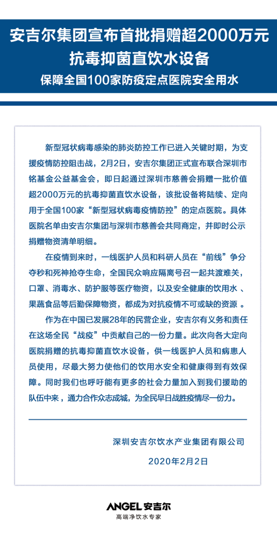为进一步参与新型冠状病毒感染的肺炎疫情防控工作,2月2日,安吉尔集团宣布联合铭基金公益基金会,即日起通过深圳市慈善会捐赠一批价值超2000万元的抗毒抑菌直饮水设备。该批设备将陆续、定向用于全国100家“新型冠状病毒疫情防控”的定点医院,具体的医院援助名单届时将由安吉尔与深圳市慈善会共同商定。