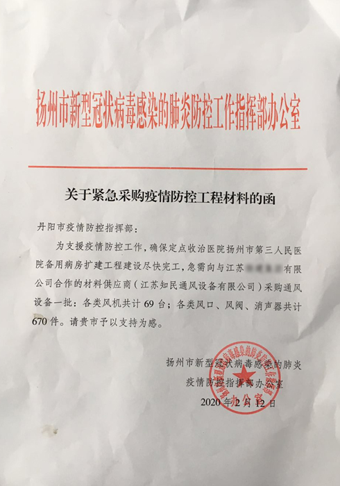 自湖北省武汉市发现新型冠状病毒感染的肺炎以来,全国各地积极响应众志成城展开了疫情攻坚战。扬州市第三人民医院为支援疫情预防工作,确定为定点收治医院。该医院备用病房为了扩建工程建设尽快完工,向我公司采购一批通风设备。
