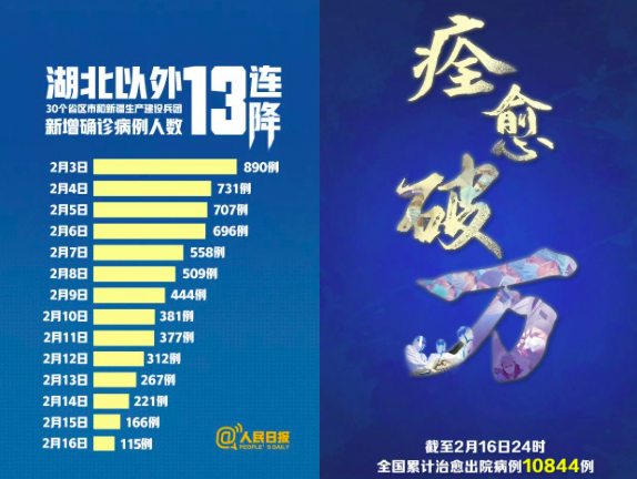 连日来,防抗新冠肺炎疫情工作取得了令人振奋的进展,据国家卫健委数据统计,2月16日0~24时,全国湖北以外30个省(自治区、直辖市)和新疆生产建设兵团新增确诊病例115例,连续13天下降,部分省区出现了0增长,全国累计治愈出院数已超过一万,为10844例。