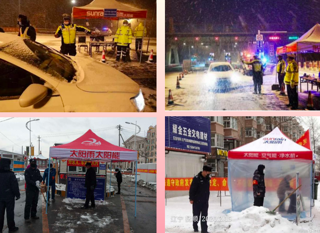 我们看到了在辽宁、在山东、在江苏、在河南……等等很多地方,风雪中的太阳雨红帐篷犹如一簇火焰,向人们传递着一份温暖,为寒冬仍坚守在战疫前线的工作人员加油助力。