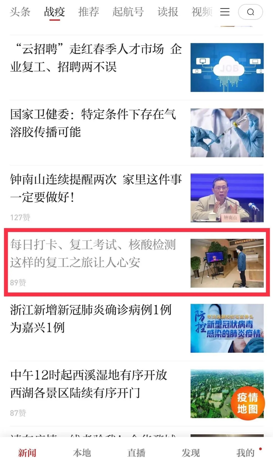 2月19日,浙江新闻客户端战疫专栏刊登了《每日打卡、复工考试、核酸检测这样的复工之旅让人心安》,着重介绍了公司如何落实防疫防控及安全复工复产等各项工作,报道指出:复工之旅很繁琐,但特殊情况下,这样的细致让人心安。