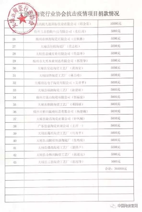广东大埔县陶瓷行业协会在2月9日向会员单位发起倡议,积极弘扬团结互助的伟大精神,共克时艰、共抗疫情,截止到2月20日共筹到捐款365000元,将用于统一采购防护物资。