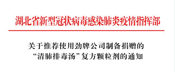 2月22日,湖北省新型冠状病毒感染肺炎疫情指挥部下发通知文件,向全省推荐使用劲牌公司制备捐赠的“清肺排毒汤”中药配方颗粒,充分发挥中医药在新冠肺炎治疗中的作用。