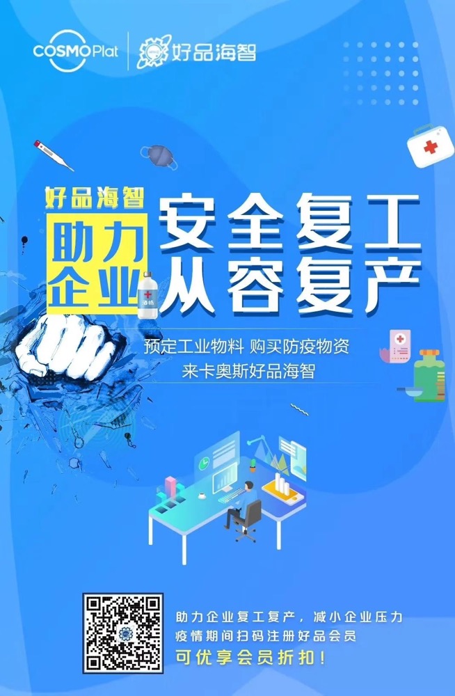 卡奥斯COSMOPlat旗下深耕B端的工业服务平台“好品海智”,提供工业品成套服务,推出企业复工全节点防护方案,通过“出门时”“途中”“电梯内”“办公室”“工作中”“餐饮前”“下班时”“回到家”等8个全节点场景,使复工安全从容。