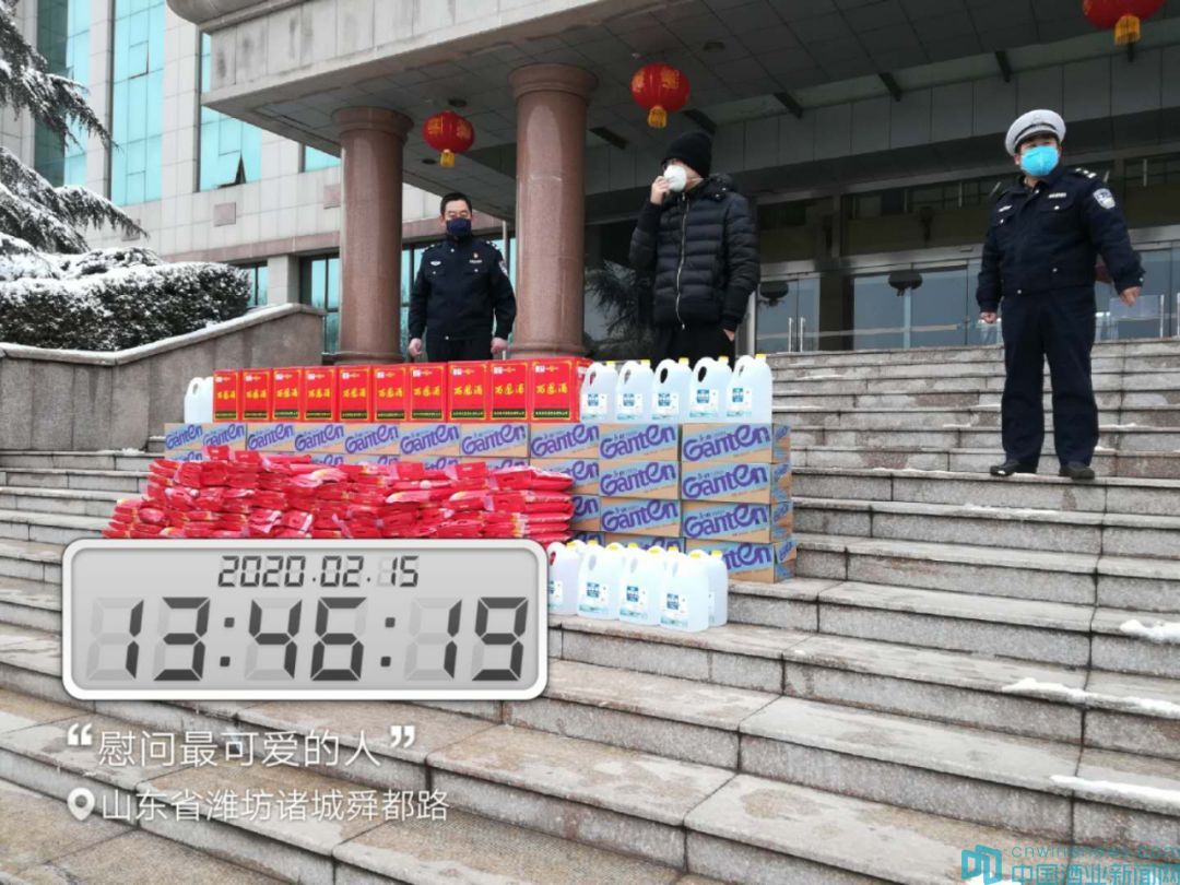 山东分公司在接到总公司安排后,迅速反应,克服物资短缺、防控道路管制等困难,组织山东各地经销商第一时间将慰问品送到当地抗疫第一线。继2月14日组织7家经销商后,2月15日在山东诸城市组织当地经销商诸城市百龙名酒经营部对诸城市交警大队进行慰问,捐赠抗疫物资。