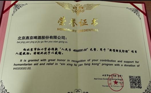燕京啤酒向北京市红十字会捐赠400万助力抗“疫”
