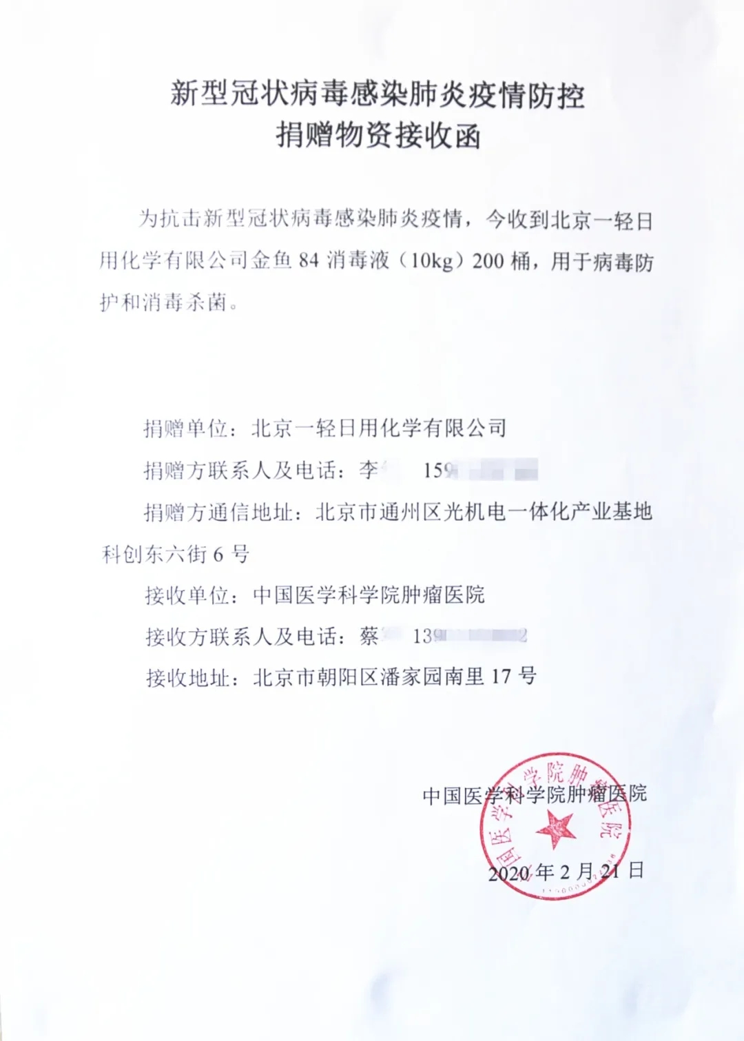 新冠肺炎疫情发生以来,北京一轻日化积极投入到疫情的防控保供工作中。目前,疫情防控虽然向好的态势发展,但是,防控工作任务依然十分艰巨。近日,在抗疫物资极其短缺、物资运输十分困难的情况下,北京一轻日化克服重重困难,继不久前捐赠北京医院和中国医学科学院广安门医院之后,再度将4000公斤“金鱼”84消毒液捐赠到中国中医科学院肿瘤医院和北京安贞医院用于疫情防控,为白衣天使保驾护航。 打赢防疫战,我们在行动