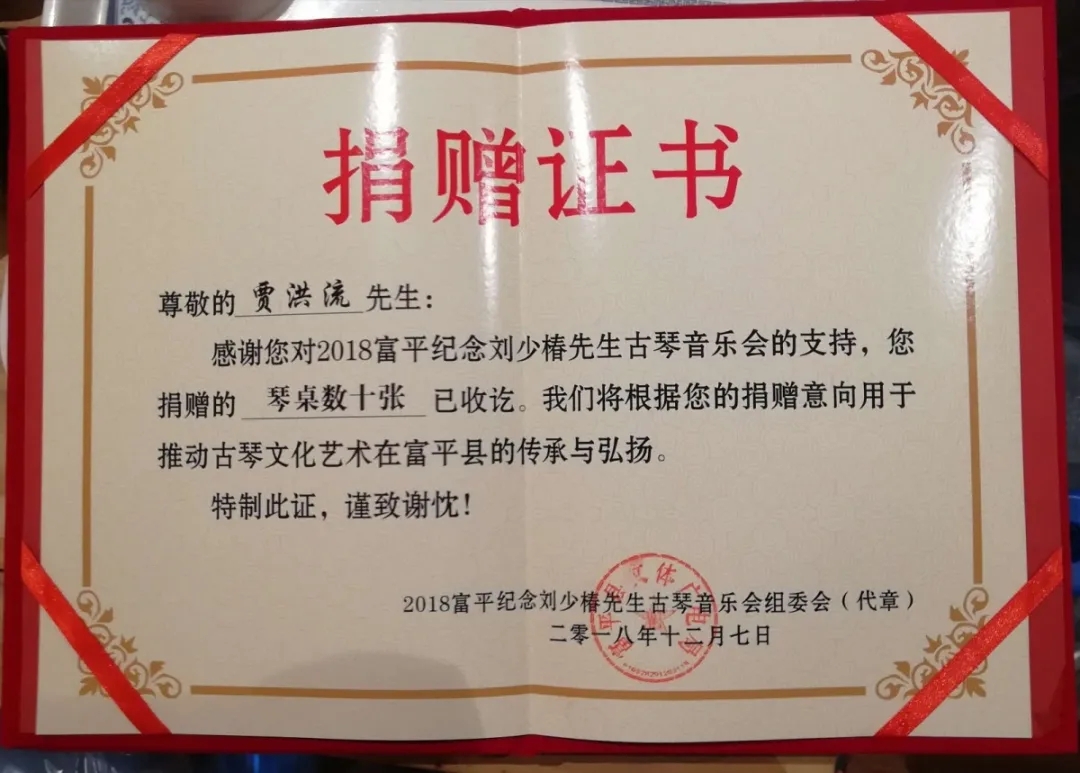 “富平纪念刘少椿先生古琴音乐会”举行时,中昊捐赠了古琴、琴桌。