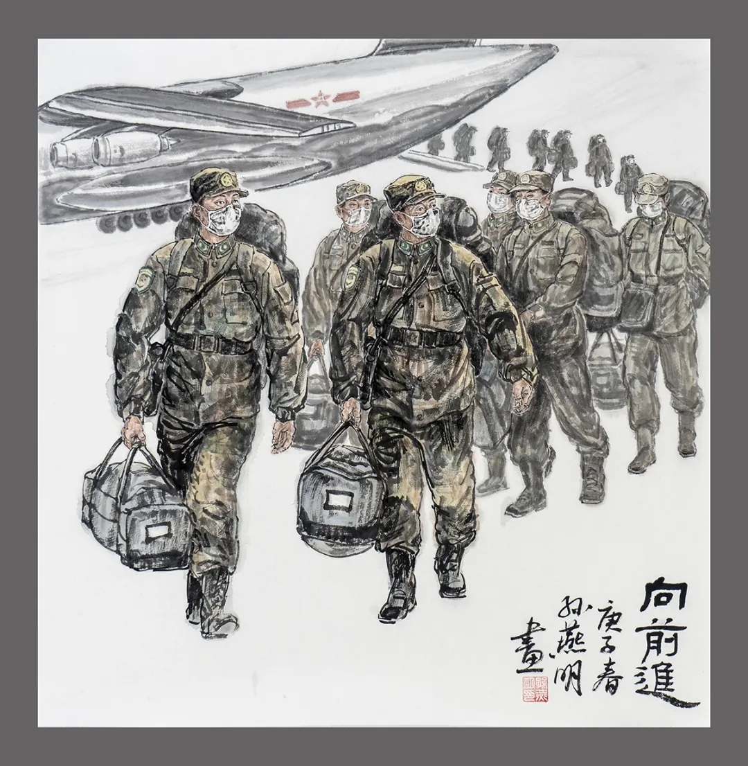 反映军事题材的《向前进》,描绘了军队医疗队乘坐空军国产运-20大型运输机抵达武汉的支援行动。关键时刻人民子弟兵冲在最前线,勇挑重担,守护人民生命安全和身体健康。技法上运用了水墨小写意的手法造型,特别是画面布局上从近景至远景呈S形构图,重点突出了前面两个军人的威武形象。