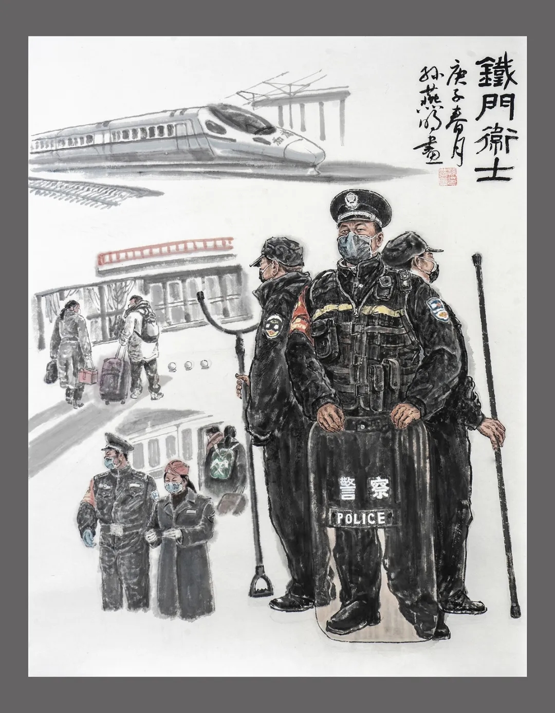 《铁门卫士》,表现了在疫情时期一线执勤的铁路警察克尽职守,把好城市高铁站的大门。手法上应用了工写结合的水墨造型,经营位置上主题人物一个铁警和二个保安构成了直立的山势,左画面上中下三块辅景分别和主景形成呼应对比。