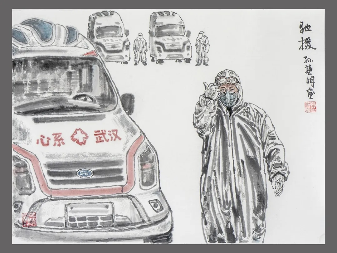 《江铃驰援》,表现了在疫情严重时期,江西江铃集团紧急支援了一批救护车给武汉急用。体现了江西的力量以及江西和湖北长江两岸的亲情。用含水多的墨笔勾线,墨迹扩散的浸透效果能逼真的画好江铃司机穿着的白色防护服的柔软质地。