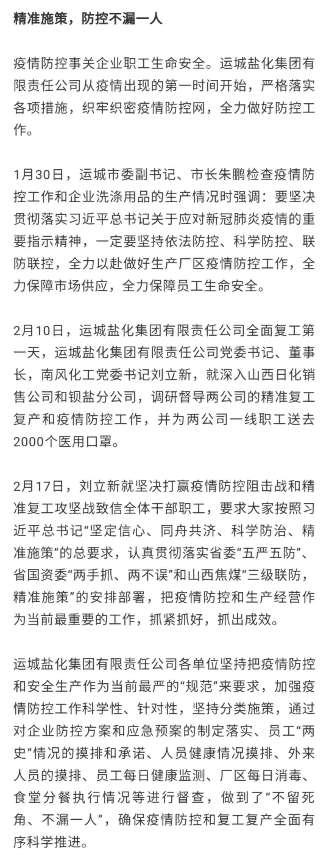 一边严防死守,狠抓疫情防控;一边复产复工,强化供应保障。运城盐化集团有限责任公司坚定信心、同舟共济、科学防治、精准施策,为打赢疫情防控阻击战提供有力保障。