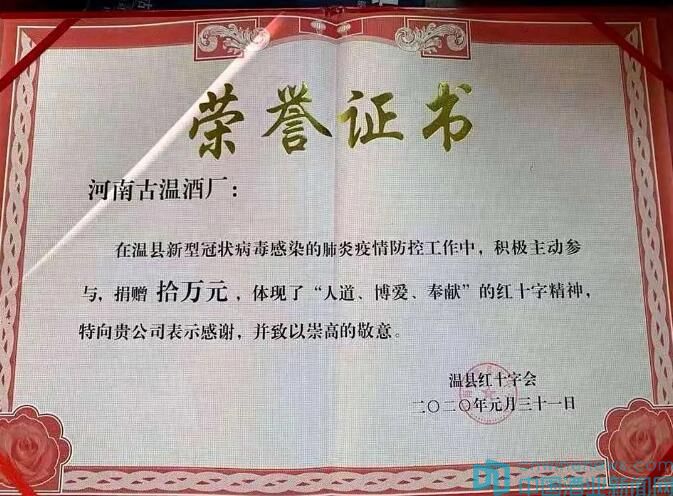 河南古温酒厂向温县红十字会捐款荣誉证书。