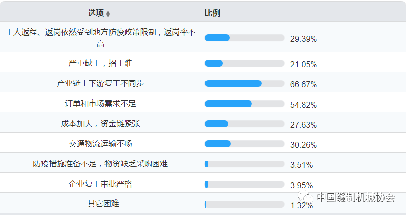 从先后两次复工复产调研来看,随着缝制机械行业企业复工复产的持续推进和深入,现阶段企业面临的困难与上期有了明显变化。 主要困难 首先,产业链上下游复工不同步对企业生产经营造成的影响成为当前主要难点。调查显示, 66.67%的调查企业反映由于产业链上下游企业开工不同步导致原辅料供应不足、零部件紧缺、部分生产线停顿、成本上涨、销售不畅等问题,对企业的产能恢复、生产效率、质量保障以及订单交付等带来挑战。 其次,市场需求低迷、订单不足成为企业复产后面临的严峻挑战。调查显示,54.82%的企业反映由于市场需求低迷,导致订单不足,对企业后续的生产经营稳定性、流动资金等带来风险和重要挑战。 此外,有29.39%的企业反映员工返岗依然受到各地疫情等级和管控限制,不能全面复工。如,天津及河北地区省份,防疫举措依然严格,人员返岗仍需要自费隔离14天,隔离费用大,导致当地企业复工复产进程缓慢; 30.26%的企业反映虽然交通物流有所改善,但是由于部分地区疫情防控尚未取消、物流公司的司机及装卸工等返岗率较低等原因,导致跨省跨地区发货、送货仍存在交通受阻、网络不畅等问题; 27.63%的企业反映在疫情影响下,采购、用工、生产、物流、防疫等成本明显上升,产业链尚未正常运行导致资金不能有效回笼,企业资金链紧张,经营压力和发展风险增加; 由于疫情影响下还有大量务工人员尚未外出,大量企业复工导致用工需求集中爆发,21.05%的企业反映存在严重缺工、招工难问题; 由于疫情影响,企业在人员出差、出国、参展以及设备上门安装服务等方面受到限制,线下营销工作尚无法展开。还有少数企业面临防疫物资采购困难、企业复工审批严格等问题。 图7 现阶段面临的主要困难 发展建议 第一,加强疫情防控不放松,稳妥有序复工复产。目前企业已经进入到复工复产的重要阶段,人员大量返岗、劳动密度增加、订单集中交付,部分企业甚至加班加点,疫情防控的压力同步加大。在这关键时期,企业更应狠抓疫情防控不放松,严格落实各项防疫措施,落实主体责任,不留防疫工作死角,保证安全生产、有序复工,推动企业各项生产经营回归正轨。 第二,积极调整应变,推动上下游协同发展。疫情的突发打乱了企业正常的生产经营计划和工作部署,短期内给企业生存发展带来了极大的风险挑战和不确定性。企业要增加风险意识,有效控制和管理现金流,不断评估疫情影响及环境变化,对经营目标与计划进行科学调整,提出有效防范应对措施;要加大营销模式创新,通过互联网直播等方式,推动营销及服务工作线上化;要关爱员工,给予信心,增强员工的使命感、责任感与事业激情,快速恢复企业战斗力;要加强与上下游产业链伙伴的沟通与协同,积极解决上下游伙伴面临的困难,发挥骨干龙头企业的产业链带动引领作用,互相支撑,共克时艰,推动全行业步入健康良性发展。 第三,苦练内功,提升企业硬核免疫力。大疫后期,企业应全面检视主营业务强不强、核心产品硬不硬、市场服务好不好,苦炼内功,努力提升企业的产品力、创新力、组织力和免疫力,增强危机风险防御能力。一要科学持续创新,推进产品结构调整与技术升级,及时把握市场发展主动权,努力走在行业技术发展的前列,不断增强发展动能;二要持续提升产品质量和打造品牌,深入贴近用户,传递品牌价值,以品牌的竞争力、知名度去扩展更大市场;三要持续推进企业的数字化管理与智能制造水平,建设现代化的管理与制造体系,不断提升市场响应能力和全要素生产率。