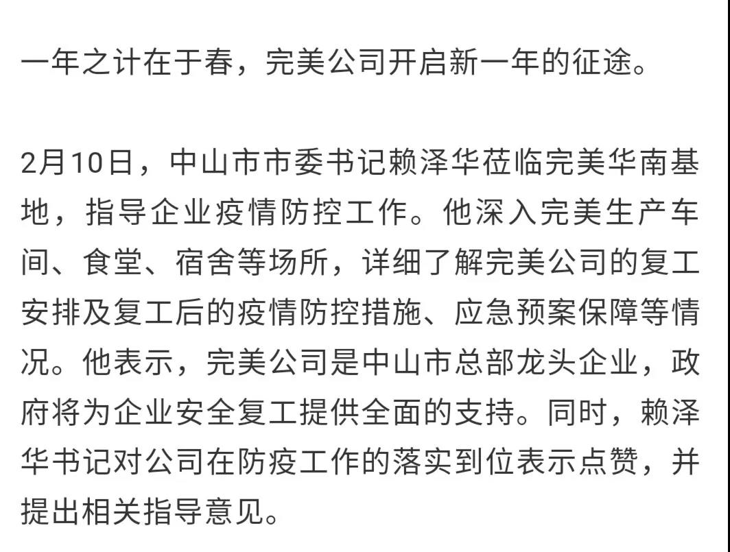 2月10日,扬州市委常委、政法委书记、邗江区委书记张耀武到访扬州完美指导企业疫情防控工作。他对扬州完美的防疫工作表示认可,希望各企业认真做好防护工作,安全有序复工复产,一定能打赢这场疫情防控战。
