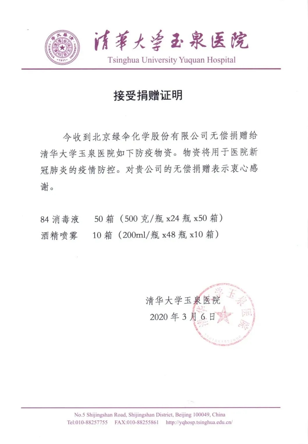 △绿伞向清华大学玉泉医院捐赠消杀产品