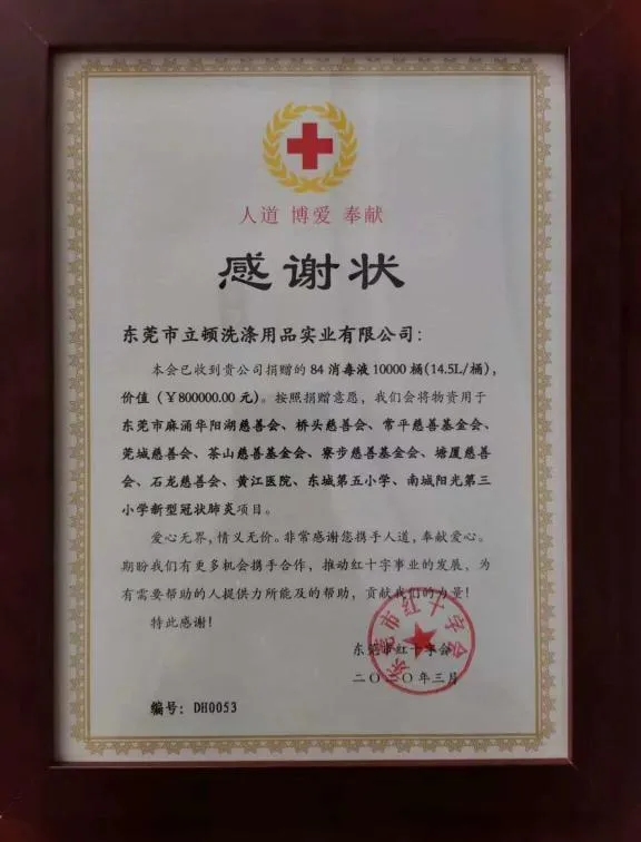 近日,立顿向东莞红十字会捐赠10000桶140吨价值80万元的消毒除菌产品。危难之时,亦有大爱。作为一家工艺设备先进,专业从事洗涤用品生产、销售及加工的企业,自疫情发生以来,东莞市立顿洗涤用品实业有限公司已累计捐赠价值200余万元抗疫产品,为抗击疫情作出了积极贡献。