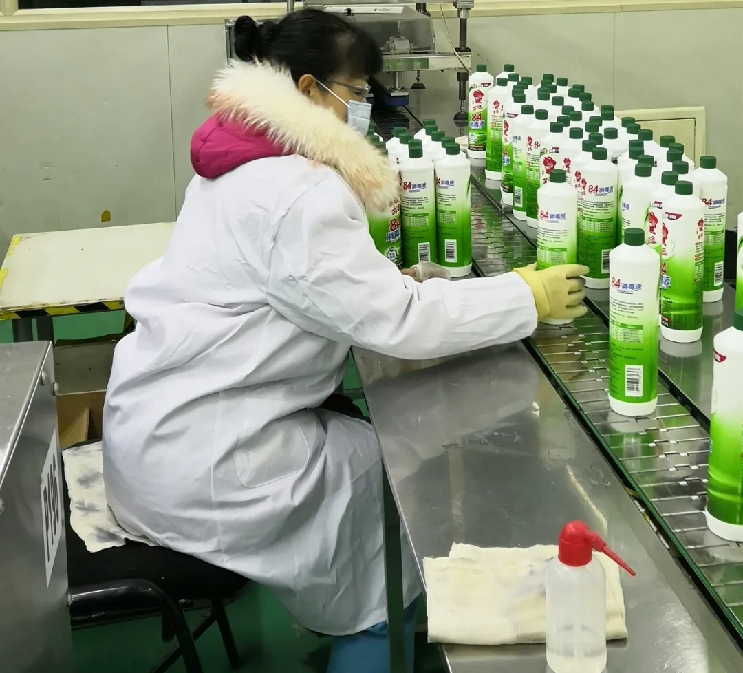 同心作战!越是艰难处,越是担当时,面对新冠肺炎疫情,玉带芯公司的党员干部也踊跃报名,参加日化公司金鱼84消毒液的生产。