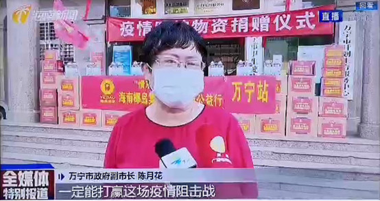 “(椰岛的公益活动)体现了企业一方有难八方相助的社会责任担当,我们坚信,在以习近平同志为核心的党中央坚强领导下,在社会各界鼎立支持下,我们万众一心、众志成城,一定能打赢这场疫情阻击战。”——万宁市政府副市长  陈月花