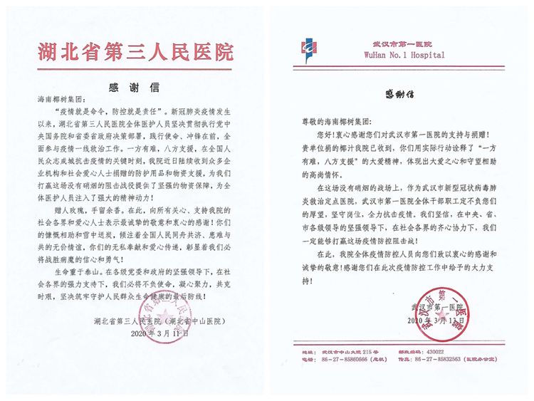 3月12日捐赠华中科技大学同济医学院附属梨园医院、捐赠武汉大学中南医院、武汉市武昌区人民政府中南路街道办事处、武汉市武昌区人民政府水果湖街道办事处。
