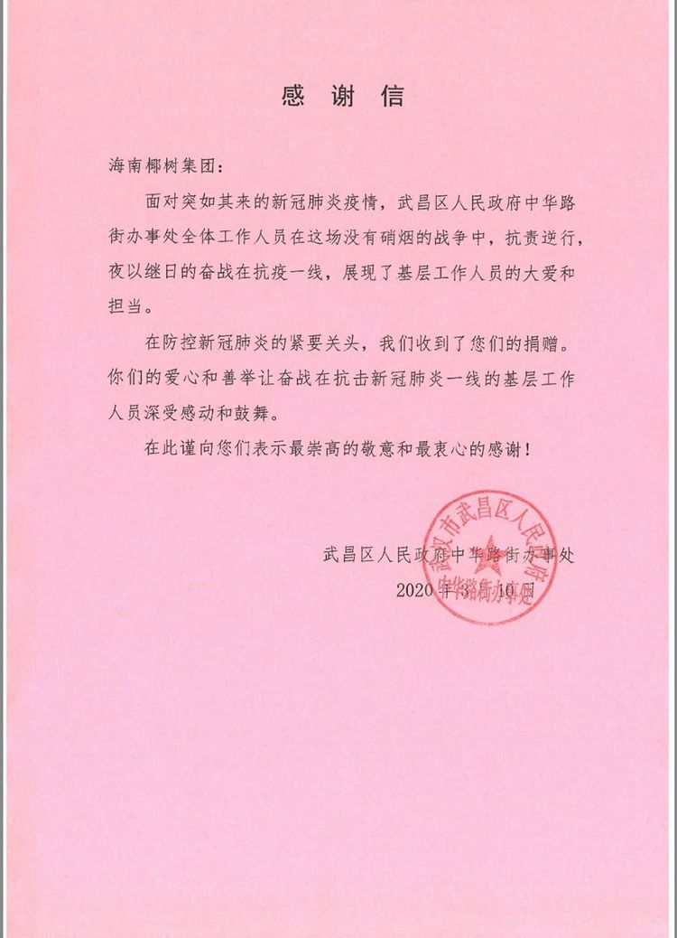 寒冬已过,迎来春暖花开,众志成城,筑起爱心防线。武汉疫区一线防护人员感谢来自“椰树的温暖”。