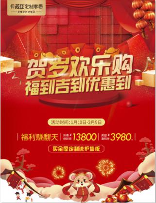 春节期间卡诺亚服务不打烊。1月10日~2月9日,卡诺亚在全国千余家门店为业主朋友们准备了“贺岁欢乐购·福到吉到优惠到”的新年开运大礼,关爱意向客户,维护老客户群体,启动线上线下互动的“新春开门红”活动,倡导“空间定制,省钱省事”,让利实在,不玩套路,吸引了不少刚需消费者咨询乃至下单。