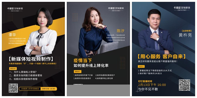 2月初,卡诺亚全面启动线上办公模式,通过钉钉App、微信直播、企业OA等部署和开展工作。营销中心渠道部、招商部、商学院、大客户部、软装事业部、市场部等部门线上工作统筹规划启动,其他各部门也在积极推动线上工作进程,以便积极响应经销商的各种需求,商学院积极组织培训课程,让经销商和员工充分利用好假期,为复工做好准备。