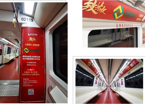 目前,新冠病毒感染的肺炎疫情正在全世界蔓延,自中国疫情爆发以来,社会各界一心、共同打响了这场抗“疫”战争。2月中旬,为向在抗“疫”战争中积极行动的爱心企业致敬,西安时代尚优传媒集团携手陕西省慈善协会,捐赠8列西安地铁2号线列车广告资源,用于“大爱同行 抗疫先锋”公益专列免费宣传。陕西圣唐乳业有限公司因为在疫情防控期间的优异表现,获批在西安地铁2号线0205、0211列车组五号车厢进行抗击疫情的公益展播。