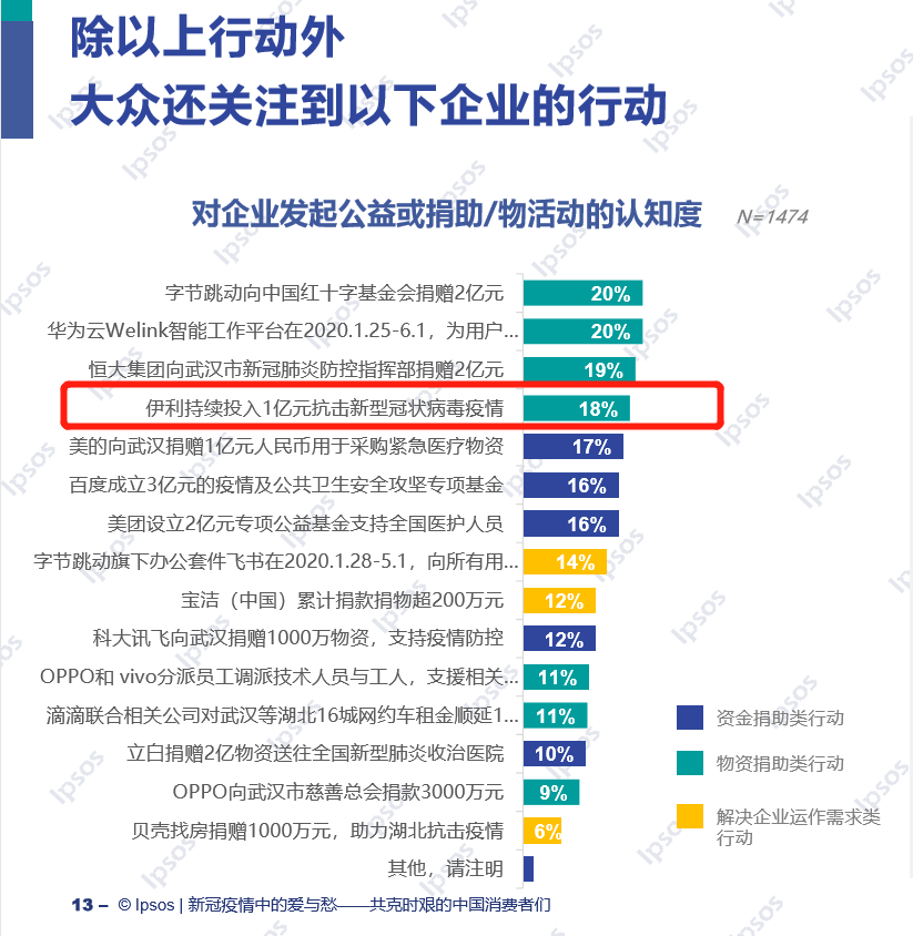全球著名市场调研机构益普索Ipsos推出的《疫情影响下的消费者系列调研》中,显示伊利抗击疫情行动收获高认知度