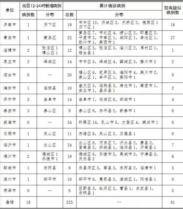 中新网2月2日电 据山东卫健委网站消息,2020年2月1日12—24时,山东省报告新型冠状病毒感染的肺炎新增确诊病例19例,累计确诊病例225例(含重症病例15例,危重症病例1例,出院5例,无死亡病例);新增疑似病例33例,现有疑似病例81例。