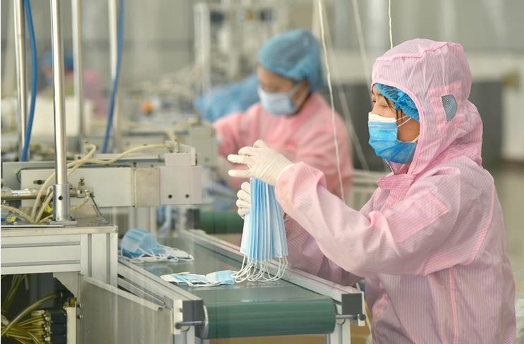 为助力抗击新型冠状病毒感染的肺炎疫情,陕西省西安市10家生产防护消毒用品的单位已紧急召回、招聘员工,满负荷生产,以保障口罩、消毒液等防护消毒用品的稳定供给。图为1月29日,西安市鄠邑区一公司员工在制作口罩。