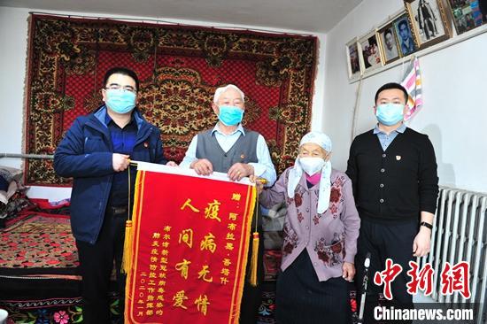 阿布拉黑·吾塔什老人和老伴将10万元捐出后,布尔津县授予“疫情无情、人间有情”锦旗。 蒋叶军 摄