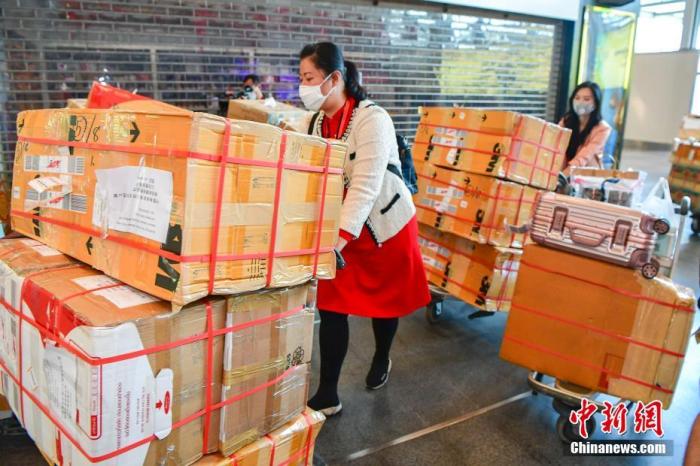 图为工作人员搬运募捐的医疗物资 中新社记者 骆云飞 摄