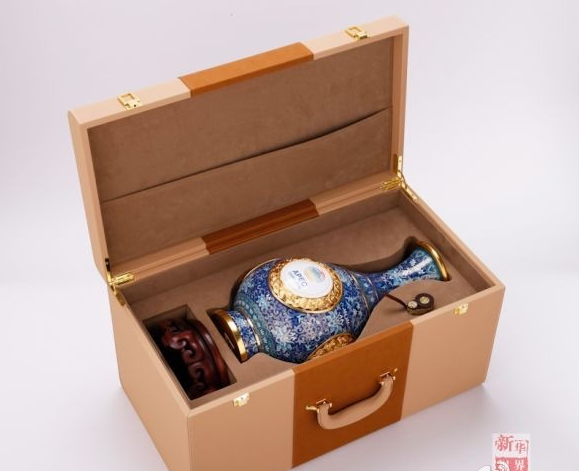 送给领导人的礼品是“四海升平”景泰蓝赏瓶,瓶身38厘米高,为天坛祈年殿38米身高的等比例缩小。赏瓶最大直径21厘米,代表APEC21个经济体。细长的瓶颈显得瓶型典雅优美,通身碧蓝的瓶身上水波荡漾,圆形的APEC会标、天坛等标志居中。工美集团相关负责人介绍说,“四海升平”景泰蓝赏瓶由中国七位国家级、北京市工艺美术大师联手创作。采用北京工艺美术“四大名旦”之一的景泰蓝工艺,以藏于北京故宫博物院的霁红釉玉壶春瓶为原型,创新性地把画珐琅工艺、錾胎珐琅、掐丝珐琅三种传统珐琅工艺结合在一起。