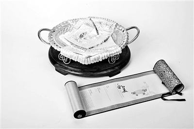 工美集团相关负责人介绍说,纯银丝巾果盘是由整块银板经过无数次纯手工錾刻而成。錾刻工艺距今已有近3000年历史,是皇家造办处独有的秘制工艺之一。