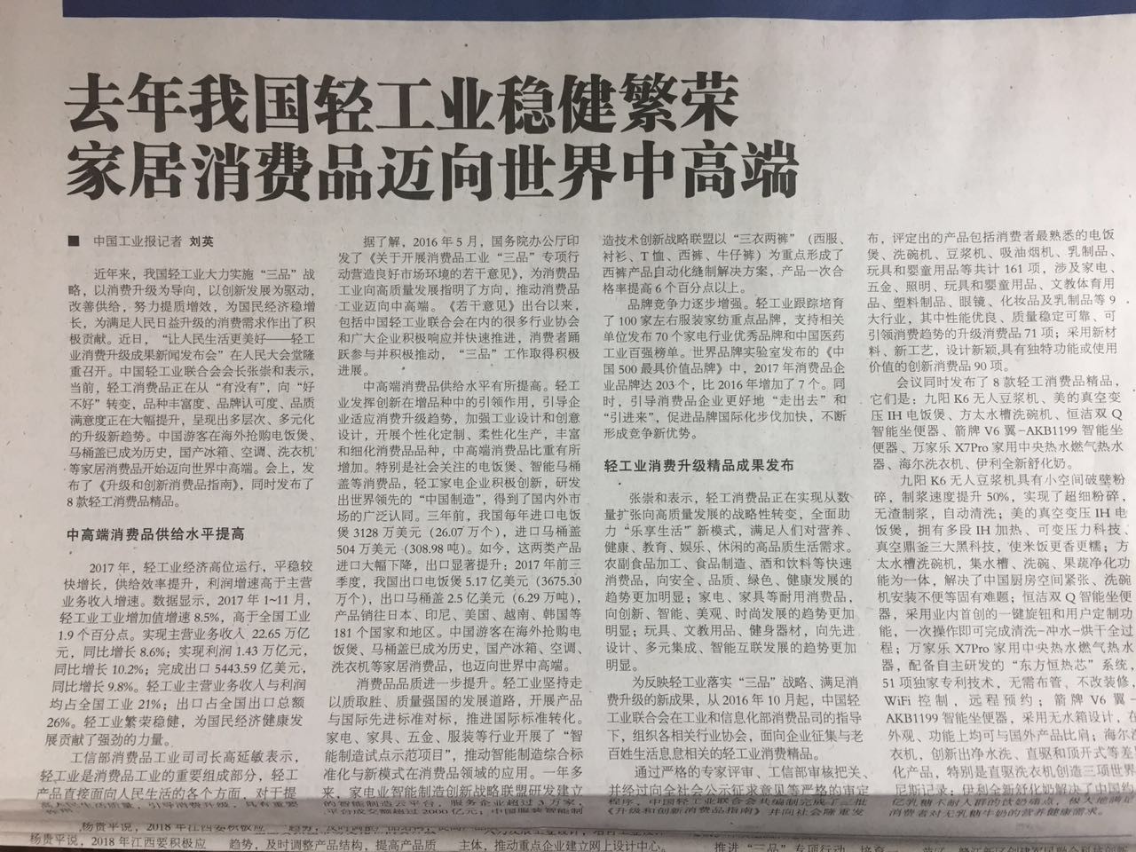 中国工业报:去年我国轻工业稳健繁荣 家居消费品迈向世界中高端