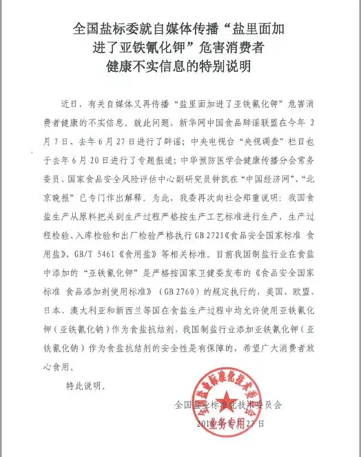 近日,有关自媒体又再传播“盐里面加进了亚铁氰化钾”危害消费者健康的不实信息。对此,全国盐业标准化技术委员会就此问题作出了特别说明。说明称,目前我国制盐行业在食盐中添加的“亚铁氰化钾”是严格按国家卫健委发布的《食品安全国家标准 食品添加剂使用标准》(GB 2760)的规定执行的,希望广大消费者放心食用。