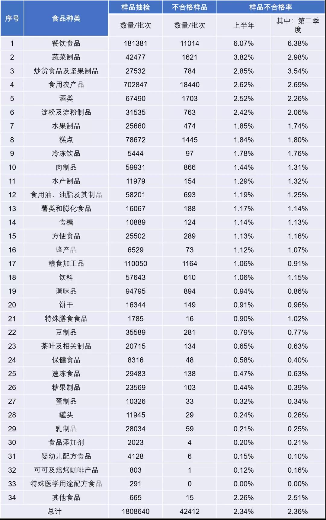 2021年上半年,全国市场监管部门完成食品安全监督抽检1808640批次,依据有关食品安全国家标准等检验,检出不合格样品42412批次,总体不合格率为2.34%,较2020年同期上升0.23个百分点。其中,第二季度抽检不合格率为2.36%。